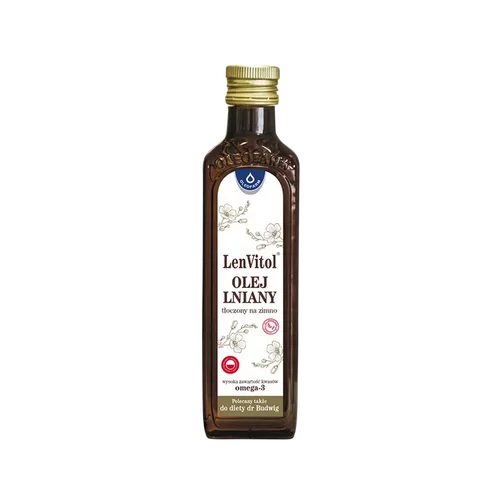 Olej lniany LenVitol® powstaje tradycyjną metodą tłoczenia na zimno. Charakteryzuje się wysoką zawartością tłuszczów wielonienasyconych, oraz kwasów tłuszczowych omega-3. Zawiera wielonienasycone kwasy tłuszczowe: kwas alfa-linolenowy (omega-3) i kwas linolowy (omega-6). Zastępowanie w diecie tłuszczów nasyconych tłuszczami nienasyconymi pomaga w utrzymaniu prawidłowego poziomu cholesterolu we krwi [jedno- i wielonienasycone kwasy tłuszczowe są tłuszczami nienasyconymi]. Utrzymanie prawidłowego stanu zdrowia wymaga zrównoważonego odżywiania i prowadzenia zdrowego trybu życia.