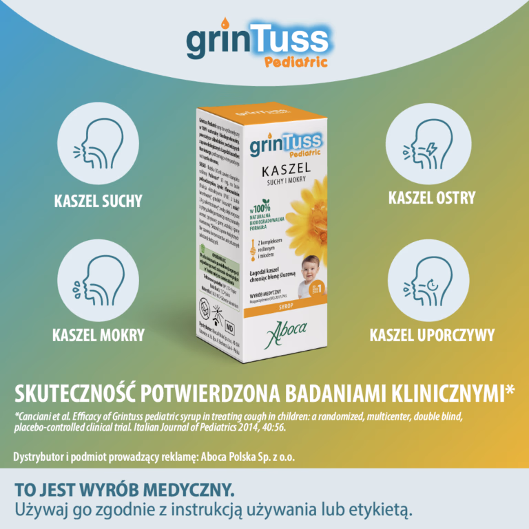 Grintuss Pediatric to syrop, które działają zarówno na etapie kaszlu suchego, przeciwdziałając zapaleniu błony śluzowej, jak i na etapie kaszlu z mokrą wydzieliną, sprzyjając jej nawilżeniu i eliminacji z górnych dróg oddechowych.
