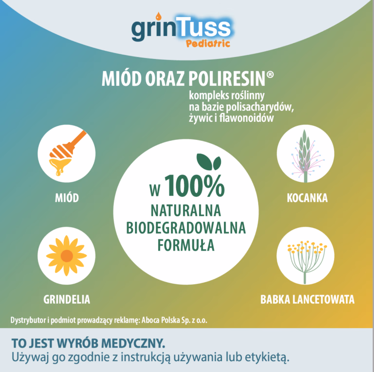 Grintuss Pediatric, na bazie Poliresin® – kompleksu roślinnego – i Miodu, ma w 100% naturalną, biodegradowalną formułę ze składnikami z upraw ekologicznych.