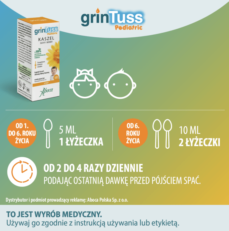 Grintuss Pediatric syrop jest wskazany w leczeniu kaszlu, zarówno suchego, jak i mokrego, u dzieci powyżej 1. roku życia. Jest zalecany zarówno przy kaszlu ostrym, jak i w przypadku kaszlu przewlekłego.