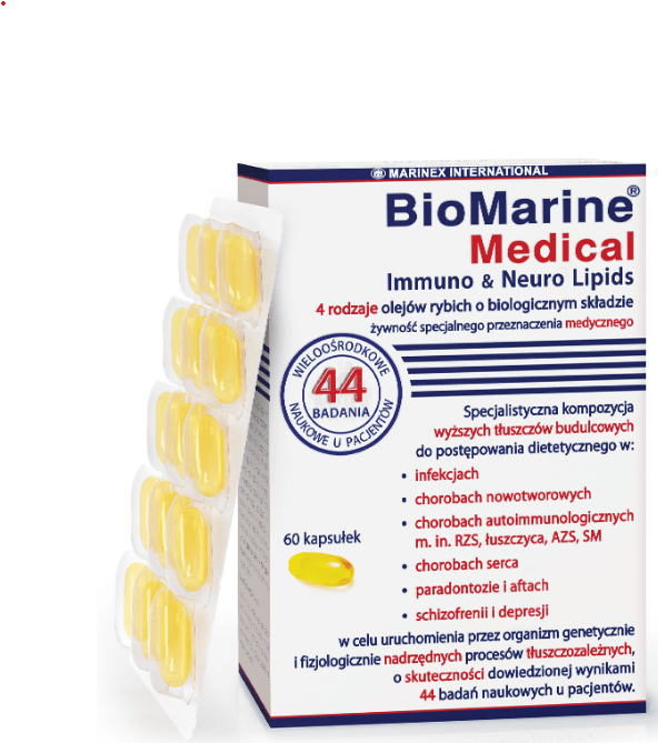 Ze względu na stosowaną w tej fazie chorób 2-4 krotnie większą ilość, zalecana jest forma płynna BioMarine®Medical Immuno & Neuro Lipids 4 rodzaje olejów rybich o biologicznym składzie (żspm). |
