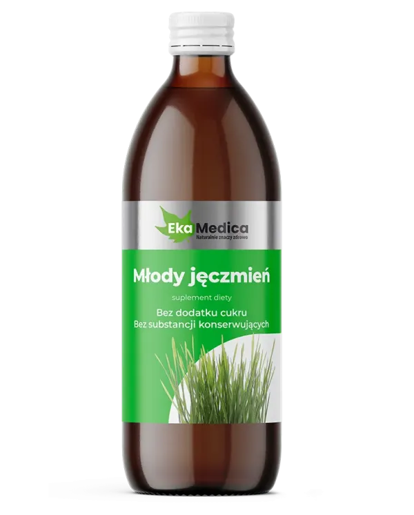 Młody jęczmień – suplement diety w formie płynnej, wyprodukowany z soku 100% z pędów młodego jęczmienia z dodatkiem naturalnej witaminy C pochodzącej z ekstraktu z owoców camu camu. Pasteryzowany.