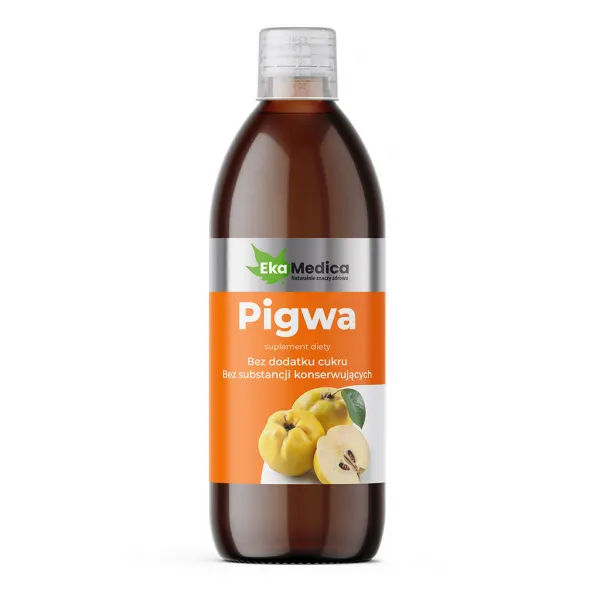 Pigwa – suplement diety w formie płynnej, wyprodukowany z puree 100% z owoców pigwy pospolitej z dodatkiem naturalnej witaminy C pochodzącej z ekstraktu z owoców camu camu. Pasteryzowany.