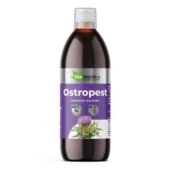 Ostropest – suplement diety w formie płynnej wyprodukowany z ekstraktu z nasion ostropestu plamistego. Pasteryzowany.